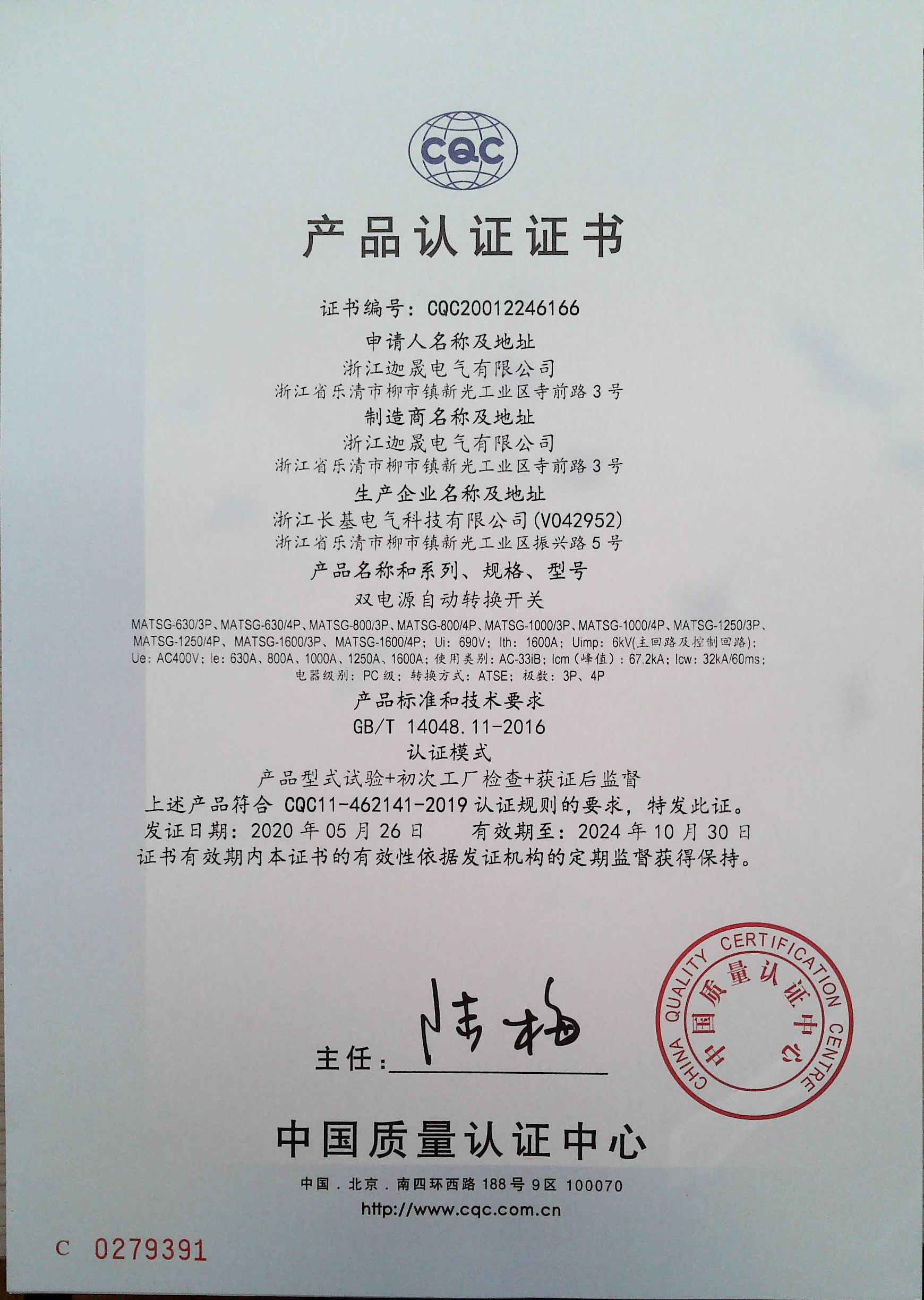 MATSG-630-1600双电源CCC证书