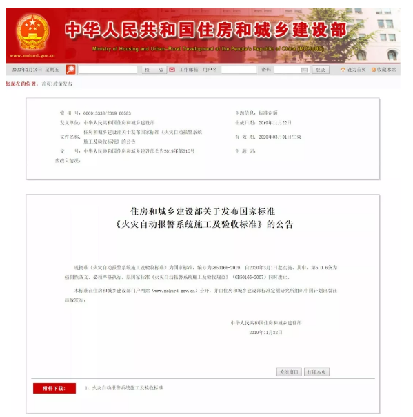 现批准《火灾自动报警系统施工及验收标准》为国家标准,编号为GB50166-2019,自2020年3月1日起实施。其中,第5.0.6条为强制性条文,必须严格执行。原国家标准《火灾自动报警系统施工及验收规范》(GB50166-2007)同时废止。