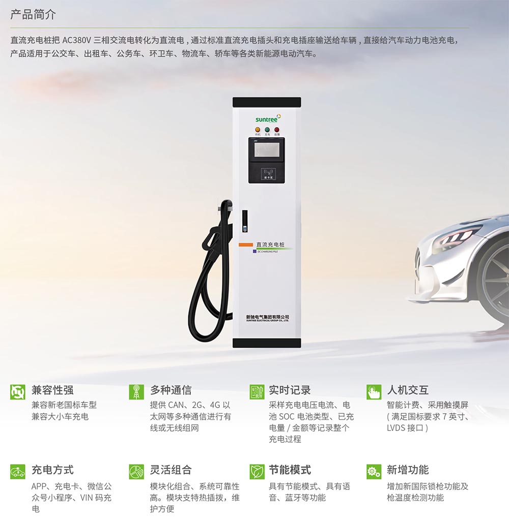 直流充电桩把 AC380V三相交流电转化为直流电,通过标准直流充电插头和充电插座输送给车辆,直接给汽车动力电池充电,产品适用于公交车、出租车、公务车、环卫车、物流车、轿车等各类新能源电动汽车。