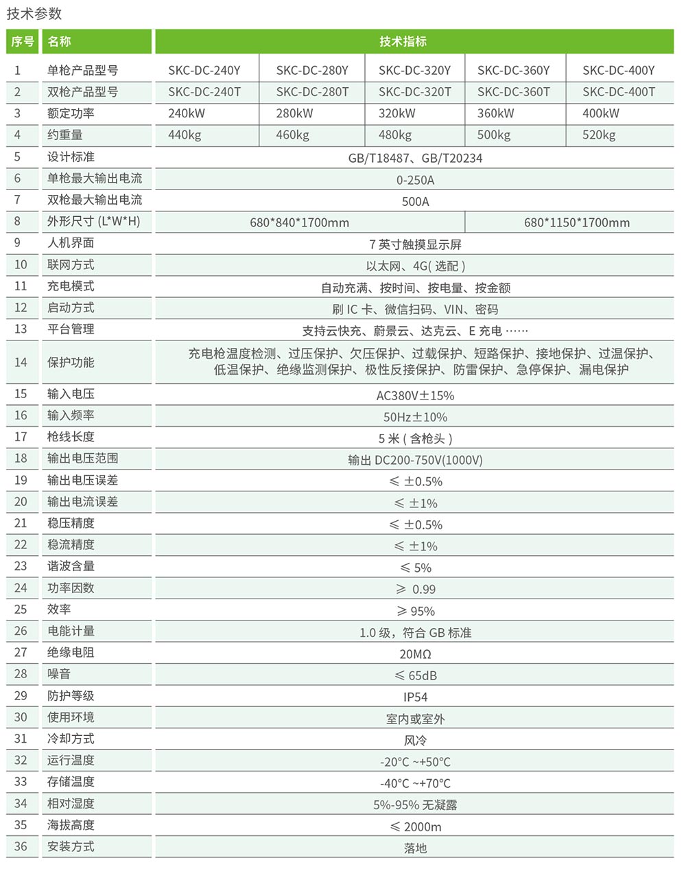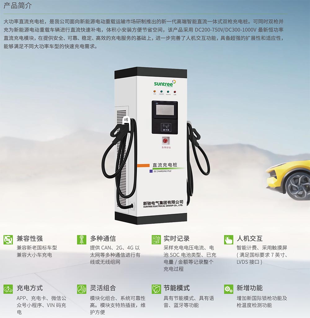 大功率直流充电桩,是我公司面向新能源电动重载运输市场研制推出的新一代高端智能直流一体式双枪充电桩。可同时双枪井充为新能源电动重载车辆进行直流快速补电,体积小安装方便节省空间,该产品采用 DC200-750V/DC300-1000V 最新恒功率直流充电模块,在提供安全、可靠、稳定、高效的充电服务的基础上,进一步完善了人机交互功能,具备超强的扩展性和适应性。能够满足不同大功率车型的快速充电需求。