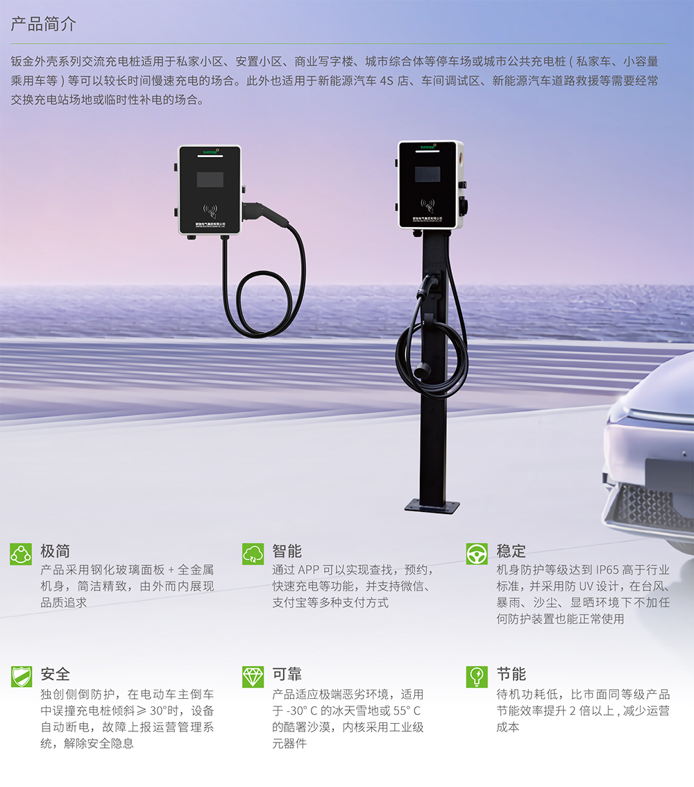 钣金外壳系列交流充电桩适用于私家小区、安置小区、商业写字楼、城市综合体等停车场或城市公共充电桩(私家车、小容量乘用车等)等可以较长时间慢速充电的场合。此外也适用于新能源汽车 4S 店、车间调试区、新能源汽车道路救援等需要经常交换充电站场地或临时性补电的场合。