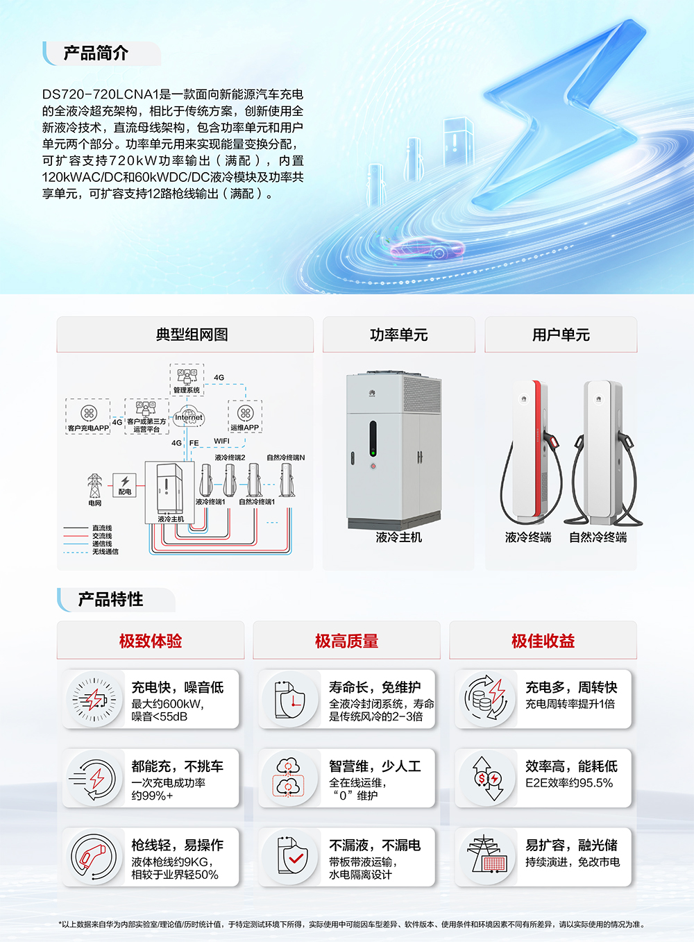 DS720-720LCNA1是一款面向新能源汽车充电的全液冷超充架构,相比于传统方案,创新使用全新液冷技术,直流母线架构,包含功率单元和用户单元两个部分。功率单元用来实现能量变换分配,可扩容支持720kW功率输出(满配),内置120kWAC/DC和60kWDC/DC液冷模块及功率共享单元,可扩容支持12路枪线输出(满配)。